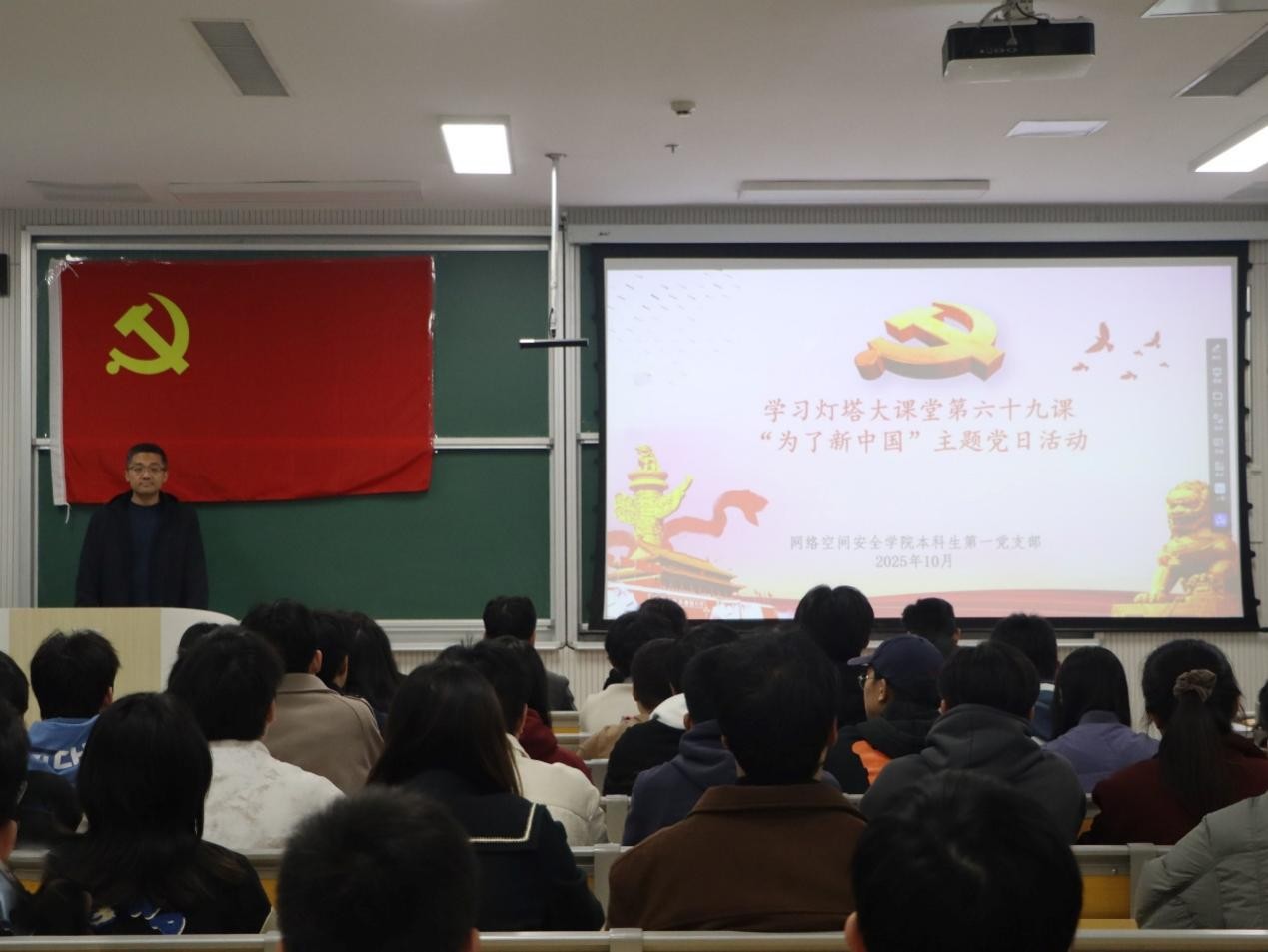 网络空间安全学院院讯(通讯员:武玉龙 赵玉婷 摄影:刘逸坤 刘昊禄)为持续深化党的创新理论武装,提升党员政治素养与思想觉悟,10月29日下午,网络空间安全学院本科生第一党支部、本科生第二党支部、本科生第三党支部分别于格物楼开展学习灯塔大课堂第六十九课“为了新中国”主题党日活动。学院党委副书记范瑞红参加了本科生第一党支部主题党日活动。