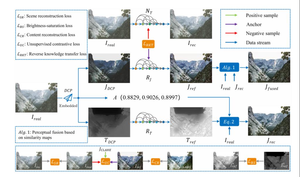 论文提出了一种新颖的零参考真实世界图像去雾方法ZRID-Net(Zero-Reference Real-World Image Dehazing Network),其核心基于深度自解耦与逆向知识迁移。具体而言,我们首先采用一种模型驱动的方法,将观测图像初步解耦为三个粗粒度成分:无雾图像、透射率图以及大气光。随后,分别通过数据驱动的方法对无雾图像与透射率图进行细化优化。此外,论文提出了一种新型的逆向知识迁移机制,充分挖掘雾化图像中的潜在先验信息,以指导去雾过程。该方法将知识迁移与对比学习相结合,从逆向角度引导细化网络远离雾特征,从而提升去雾效果。最后,论文引入了一种感知融合策略,以获得具有高可视性和真实感的无雾图像。大量实验表明ZRID-Net在定量指标与视觉质量上均优于现有的最新方法,并展现出较强的泛化能力与实际应用潜力。
