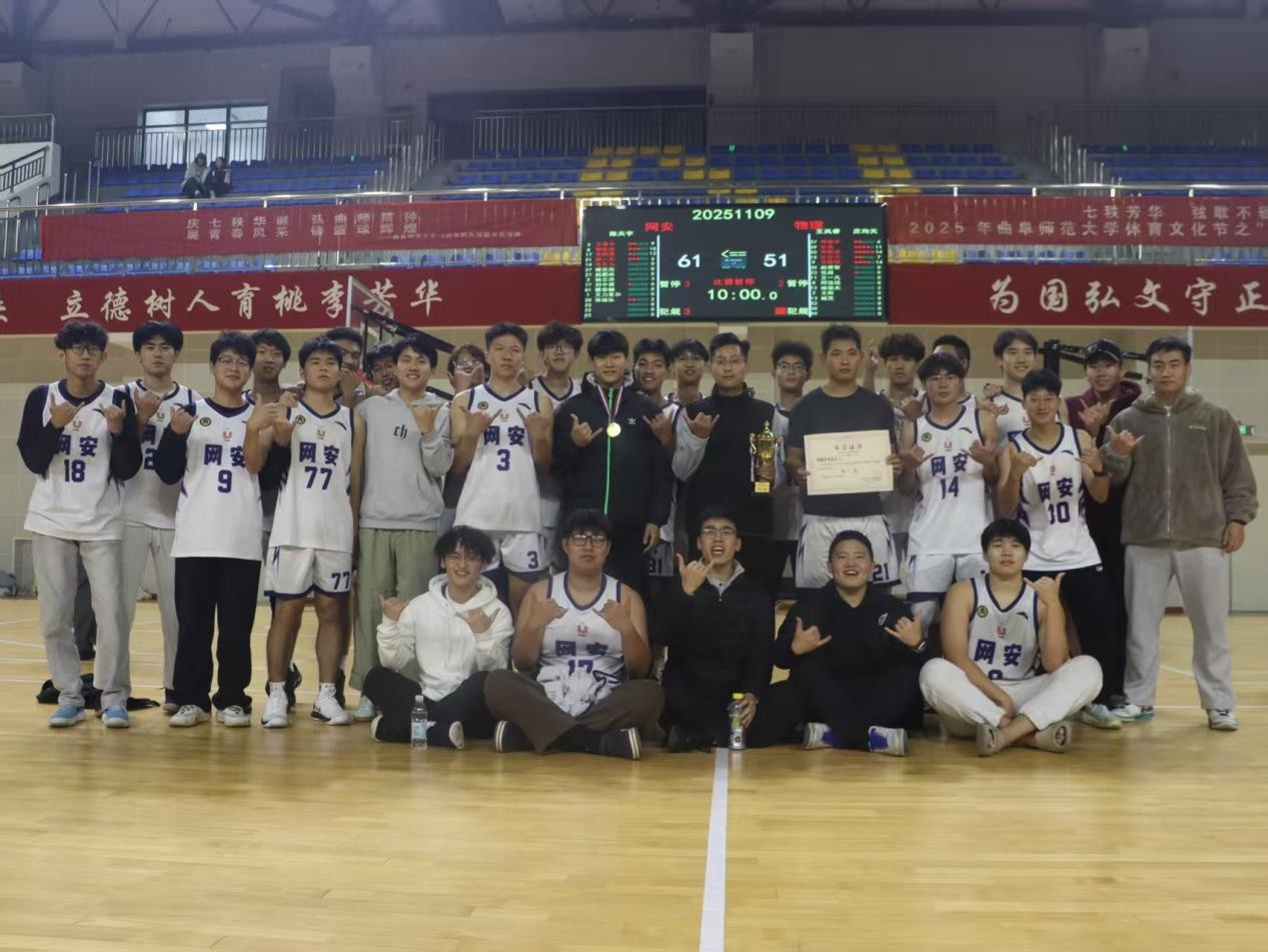 本场比赛由网络空间安全学院对战物理工程学院。比赛哨响,双方迅速进入激烈对抗,攻防节奏紧凑、你来我往,场上气氛热烈。凭借默契的配合与稳健的防守,我院球员多次打出流畅反击与精准投篮,比赛过程中节奏不断提升,双方你追我赶、比分多次交替上升,使得现场气氛愈发紧张而热烈。尤其在下半场关键阶段,我院队员顶住了对方的强势反扑,士气与斗志始终保持高昂。最终,我院队员以55:50的比分战胜对手,荣获本届“迎新杯”篮球赛冠军,此次比赛的胜利,也标志着网络空间安全学院在“迎新杯”篮球赛中已取得六连冠的好成绩。