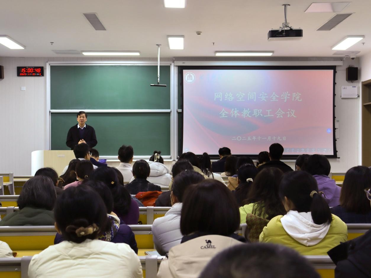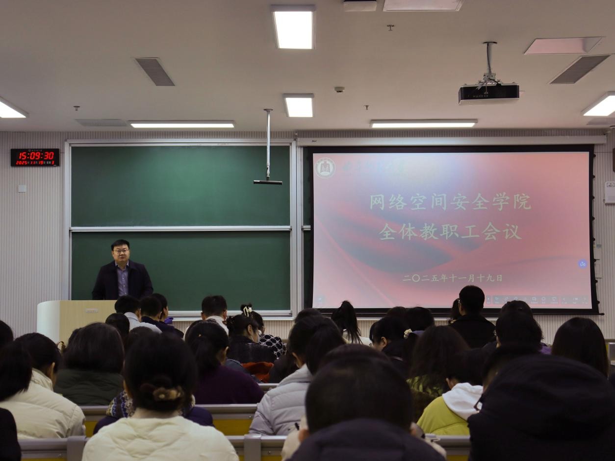 网络空间安全学院院讯(通讯员:相青 尹亦菲 摄影:邵怡婷)为进一步加强学院建设,推动学院各项工作提质增效,11月19日15:00,网络空间安全学院全体教职工会议于格物楼B105教室顺利召开。学院党委书记田云飞、院长王茂励、党委副书记范瑞红、副院长马旭以及全体教职工参加会议。田云飞主持会议。